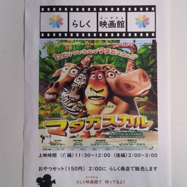 「らしく映画館」と題して、事業所の広間を映画館に見立てた映画鑑賞会を行いました。今回の作品は子どもたちに人気の「マダガスカル」。午前中に前編、午後に後編を鑑賞する二部構成で、ゆったりと映画の世界を楽しみました。