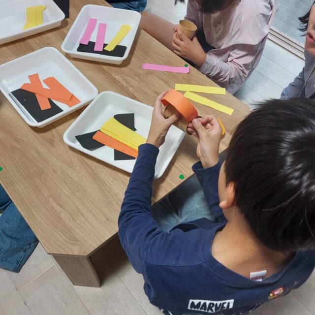 子どもたちはそれぞれの感性を活かし、顔のパーツをマイクラ風にしたり、星型やハート型にしたりと、自由な発想で工夫していました。持ち手もリボンを使ったり、色を変えたりと、細部までこだわって制作する姿が印象的でした。完成した作品を見て、ハロウィン気分を満喫!笑顔あふれる楽しい時間となりました。今後も季節を感じられる創作活動を通して、子どもたちの表現力や創造力を育んでいきたいと思います。