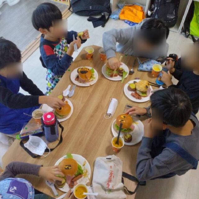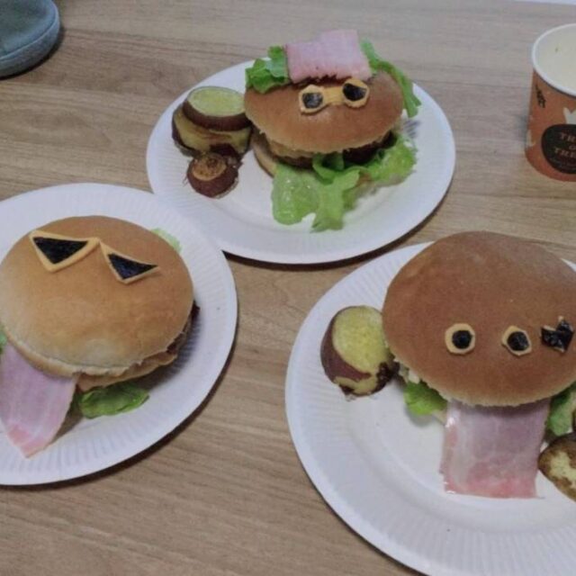 子どもたちが楽しみにしていたハロウィンパーティーを開催しました。午前中は「お昼クッキング」として、みんなでハロウィンバーガー作りに挑戦!バンズにチーズやベーコンなどで作ったおばけの顔など、見た目も楽しいバーガーが完成し、「おいしい!」と笑顔いっぱいで食べていました。