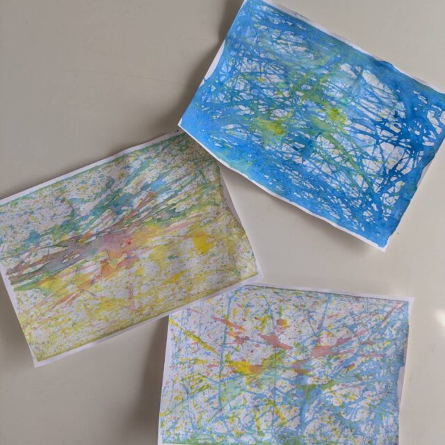 子どもたちと一緒に「ビー玉アート」に取り組みました。A4サイズの画用紙にスポイトで絵の具を垂らし、そこに5個のビー玉を入れて自由に転がすことで、偶然が生み出す模様を楽しむアート活動です。