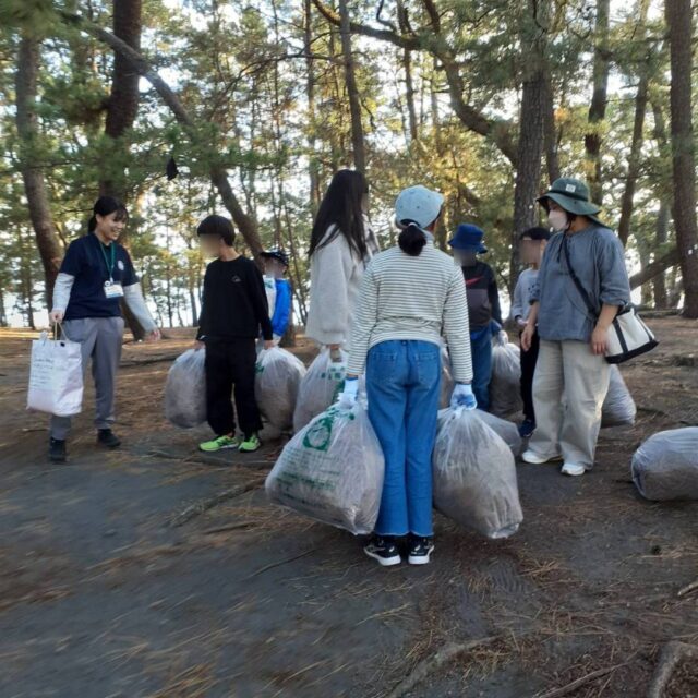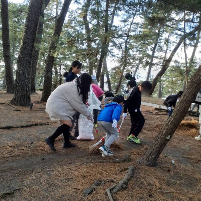 世界文化遺産にも登録されている三保松原でボランティア清掃を行いました。子どもたちとスタッフが協力し、大小の熊手を使って松葉をかき集め、袋いっぱいになるまで集めました。最初は「大変そうだな」と思っていた子どもたちも、やってみると意外と楽しく、夢中になってどんどん集めていく姿が見られました。