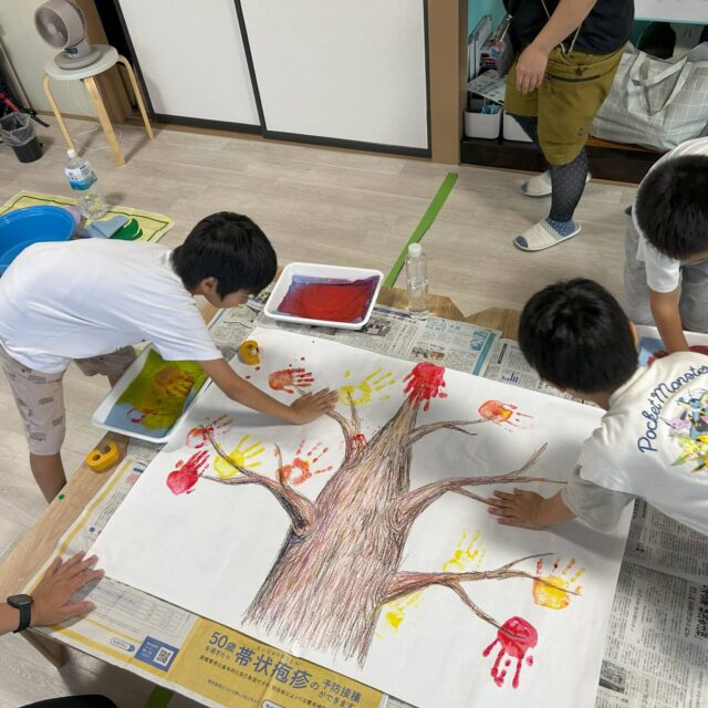 活動中は「面白い!」「もっとやりたい!」という声が聞こえ、笑顔と好奇心に包まれたひとときに。一人ひとりの手形が色とりどりの“紅葉の葉”となり、模造紙いっぱいに広がる大きな紅葉ツリーが完成しました。その姿は、まるで秋の森のように温かく、見る人の心を和ませてくれます。