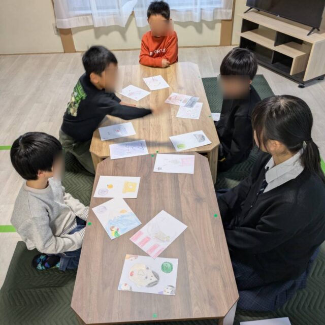 専門的支援を行う言語担当職員を中心に、小集団での療育活動に取り組んでいます。今回は、子どもたち自身が企画し、これまでに手作りした「お正月カルタ」を使って活動を行いました。読み札の言葉選びや絵札のデザインなど、制作の段階から子どもたちの創造力が発揮され、個性豊かなカルタができていました。