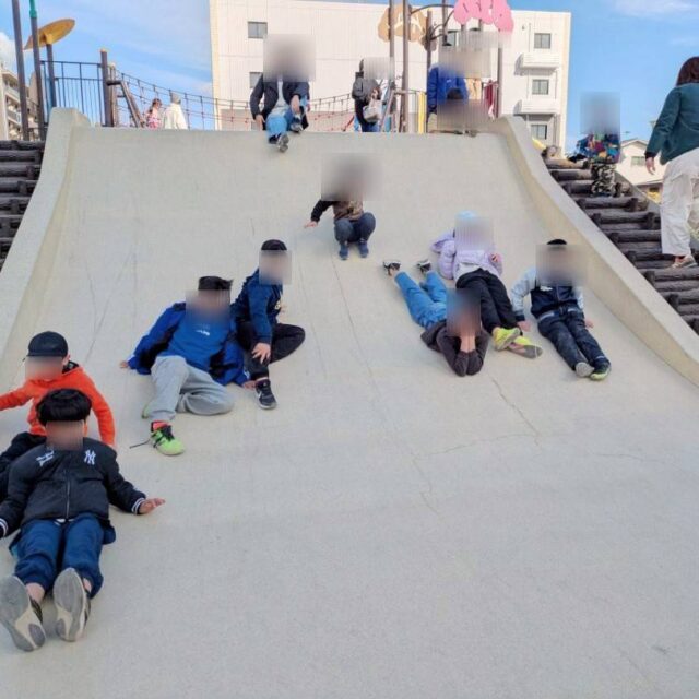 長沼駅に到着したあとは、歩いて東静岡スマイル公園へ向かいました。公園では大きな滑り台が大人気。滑り台の上に横並びで座り、誰かの「せーの!」の声を合図に一斉に滑り降りる姿は、とても楽しそうで、みんなの気持ちがひとつになっているのが伝わってきました。
